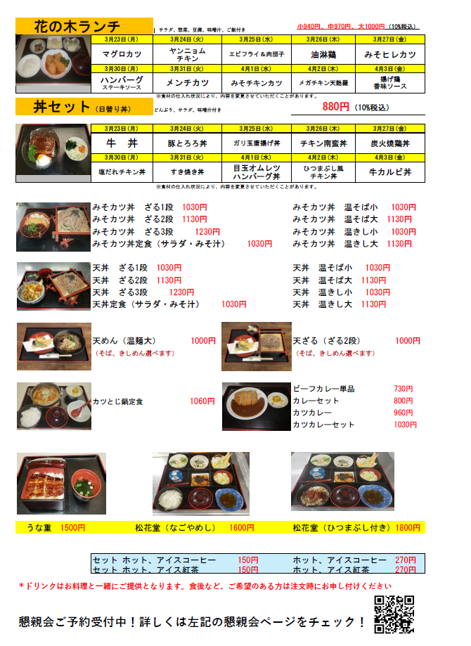 - 花の木ランチと日替わり丼セットは、スピード提供対応メニューです。お急ぎの場合は、ぜひ日替わりメニューをご利用ください