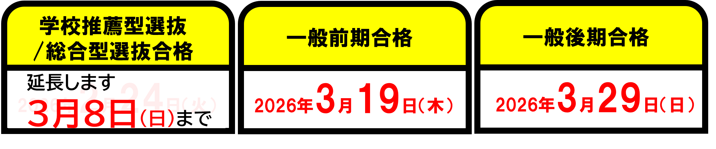 学校推薦型選抜・総合型選抜合格者のお申込み手続きの期日を延長いたします。 3/8(日)まで!!お早めにお手続きをお願い致します。