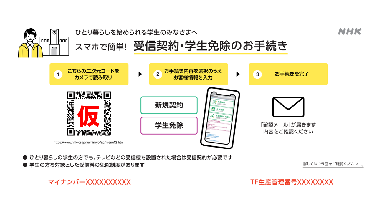 生協でお渡ししている「スマホで簡単!受信契約・学生免除のお手続き」の書類を入手ください