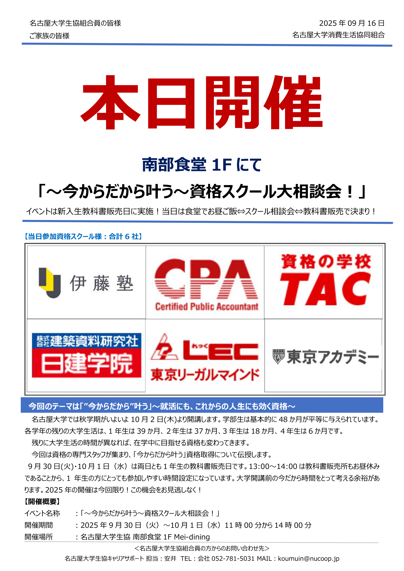 名大生協提携スクールが、一気に5社集まっちゃいます!気になる資格について、全部!一度に!聞けちゃいます!
