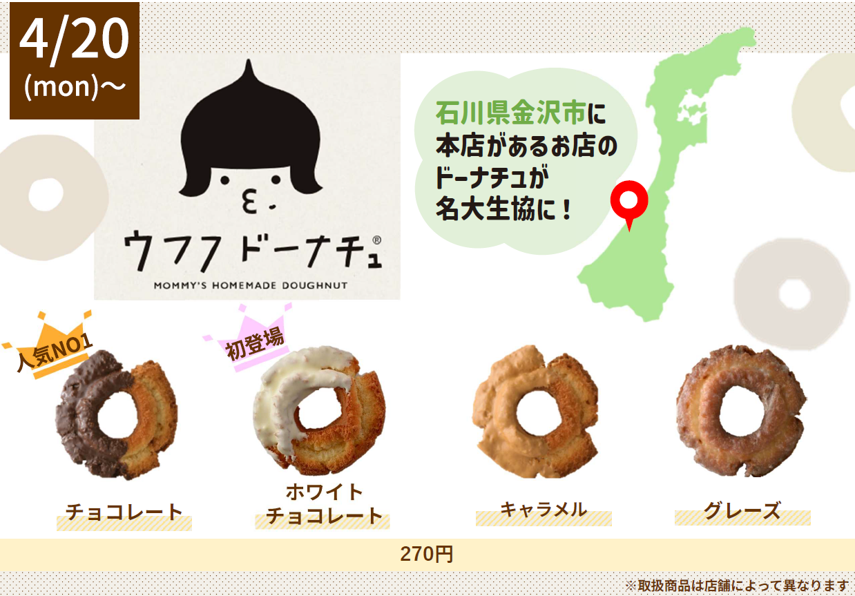 2025年度名大生協で1,600個以上販売した大人気商品、石川県金沢市のウフフドーナッチュを今年もご準備いたしました。