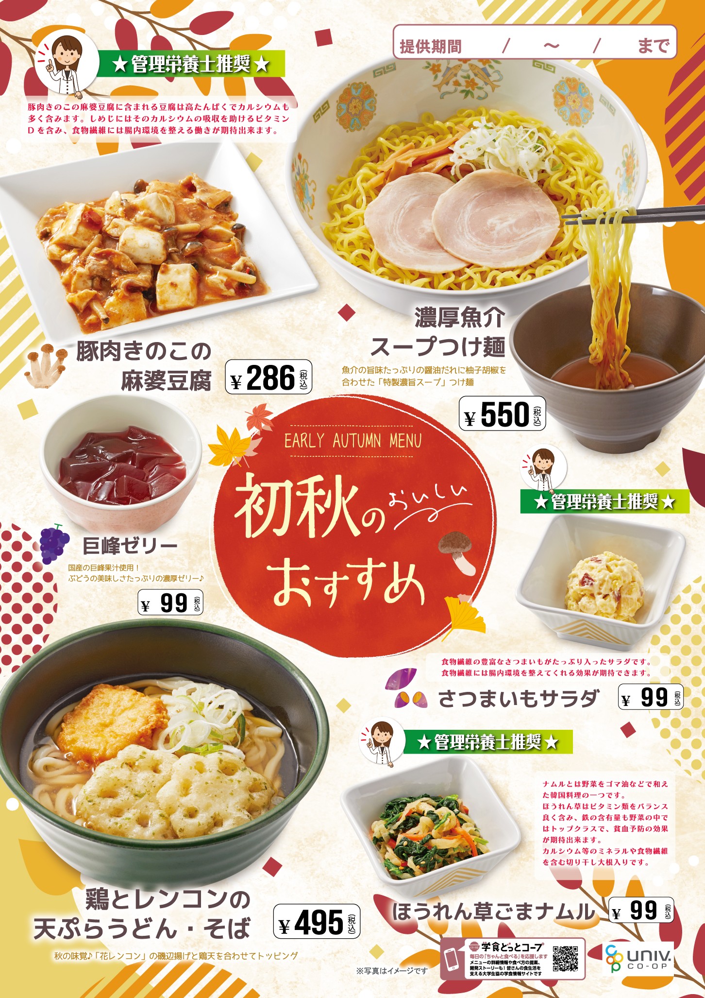 いよいよ秋学期がスタート!学びの季節とともに、食堂でも「食欲の秋」にぴったりなメニューをご用意しています!