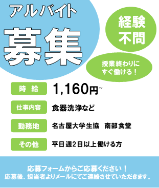 【勤務地】名古屋大学生協 南部食堂1階Mei-dining、2階彩