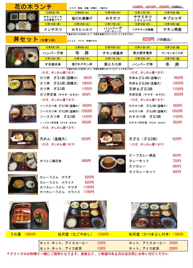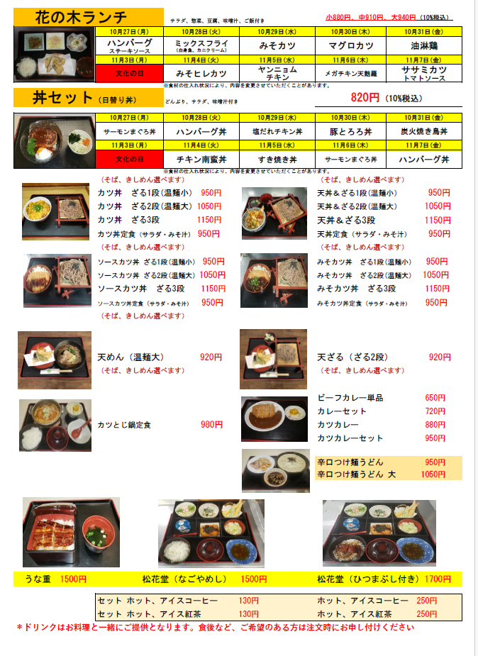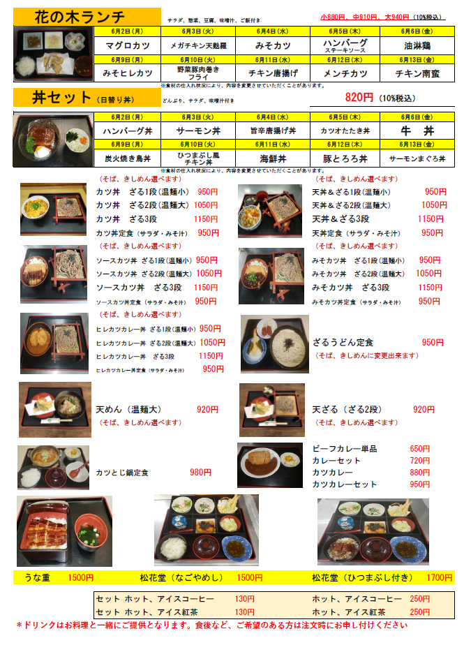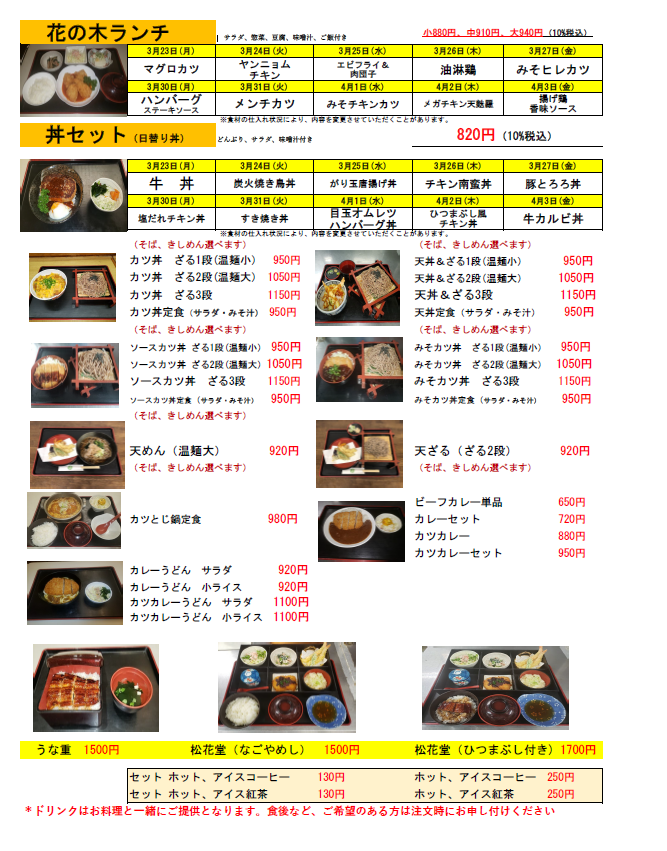 - 花の木ランチと日替わり丼セットは、スピード提供対応メニューです。お急ぎの場合は、ぜひ日替わりメニューをご利用ください