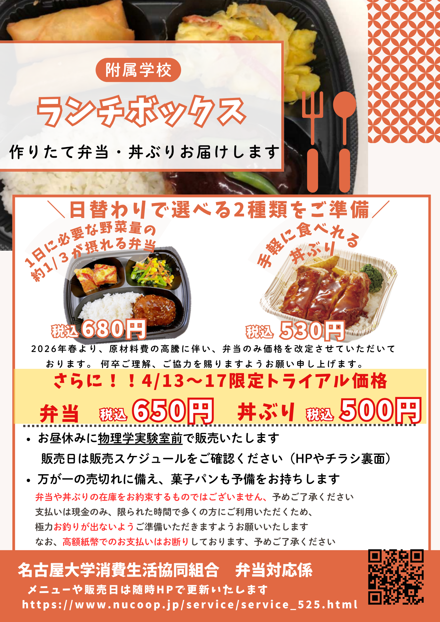 毎日食べても食べ飽きないように日替わりでメニューをご用意しております。また、育ち盛りの生徒さんたちの健康を気遣い、食事バランスを考えて開発しております温かい弁当(680円)・丼ぶり(530円)のどちらかをお選びいただけます